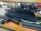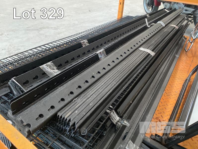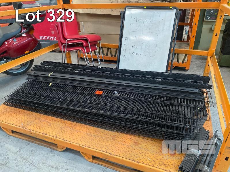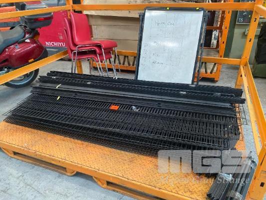 MODULAR STEEL SHELVING, BLACK STEEL WITH WIRE MESH SHELVES, 2100 x 2000mm (W), CHAIRS & WHITEBOARD