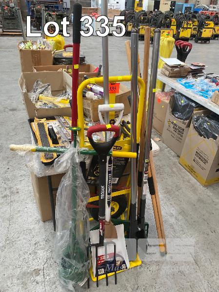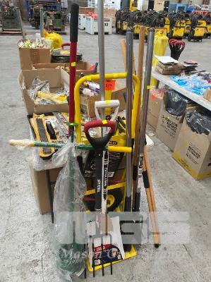 3 x SHOVELS, PITCH FORK, SACK TRUCK, POST HOLE AUGER & PINCER, HOE, ETC