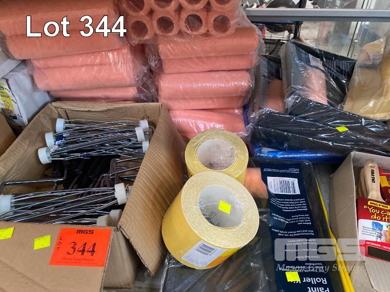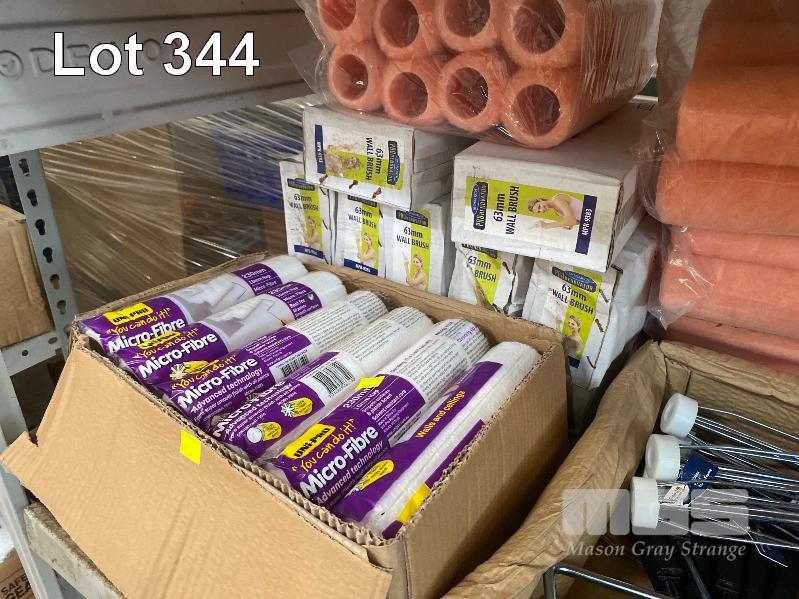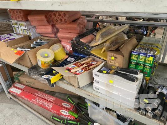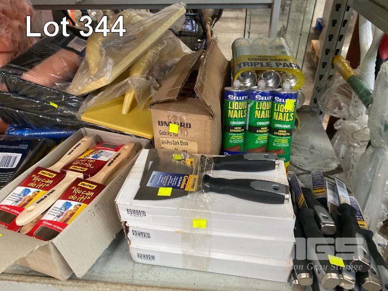 15 x BOXES ASSORTED PAINT BRUSHES, PAINT ROLLERS, SAND PAPER, SCRAPERS, 18 x TUBES SELLEY LIQUID NAILS & 1 x BOX CAULKING GUNS, ETC