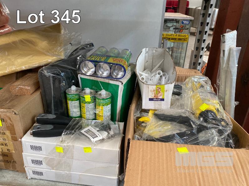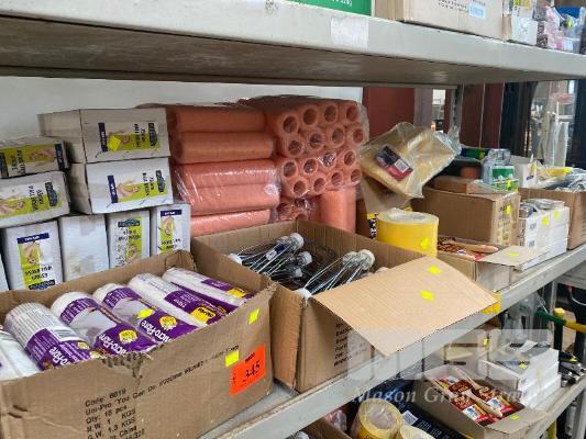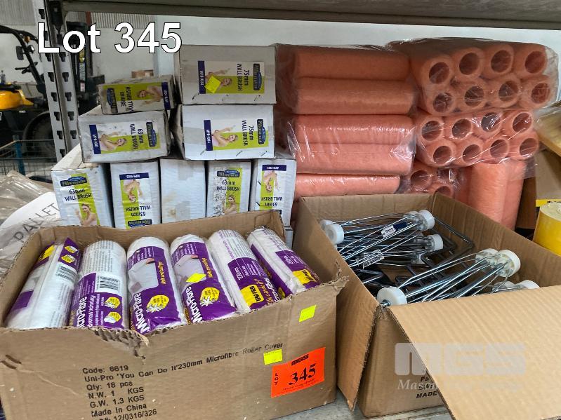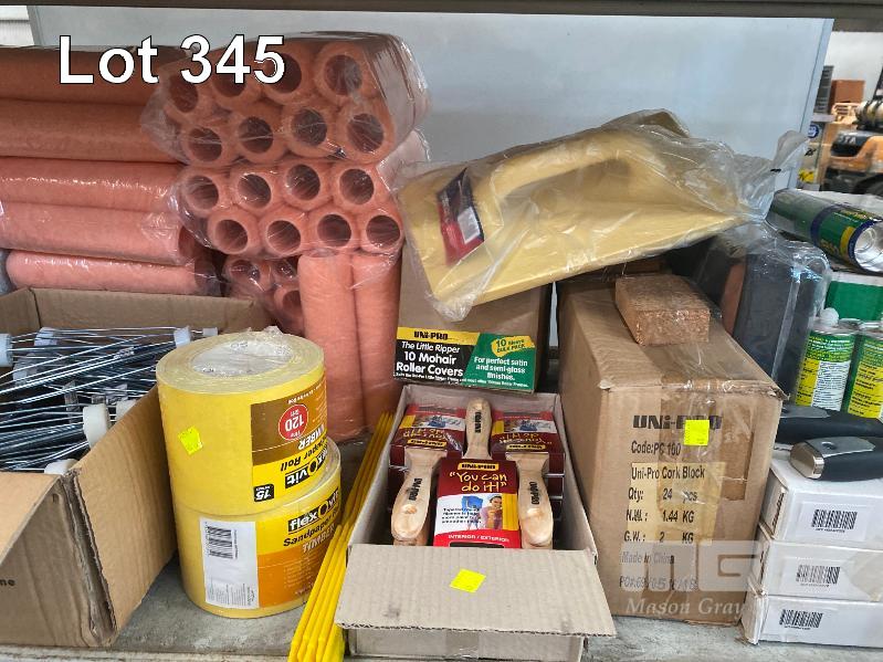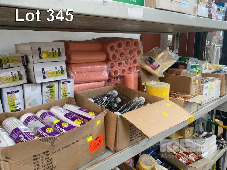 15 x BOXES ASSORTED PAINT BRUSHES, PAINT ROLLERS, SAND PAPER, SCRAPERS, 18 x TUBES SELLEY LIQUID NAILS & 1 x BOX CAULKING GUNS, ETC