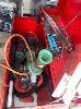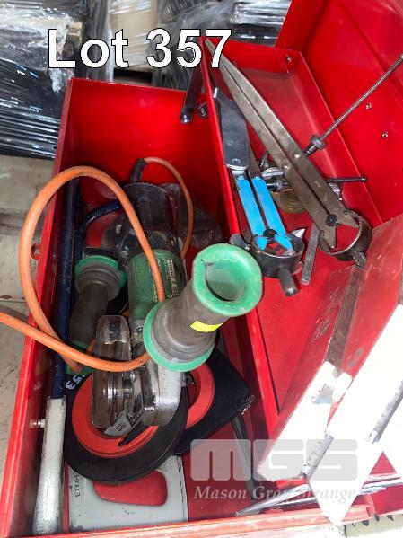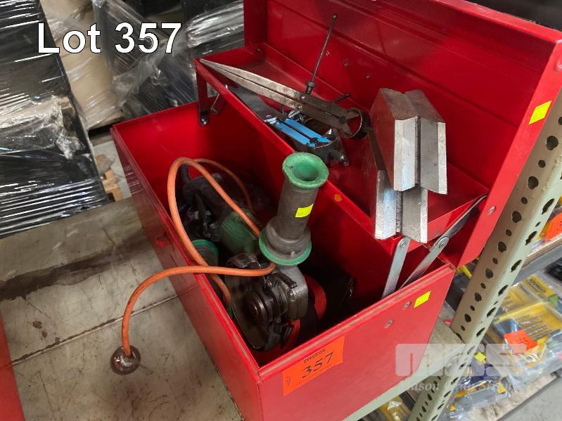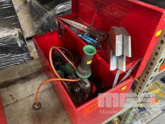 TOOLBOX & ASSORTED HAND TOOLS, INC HACKS AWS, CLAMPS, MEASURING TAPES, PROTRACTORS, MAGNETIC WELDING CLAMP BLOCKS & HITACHI ANGLE GRINDER, 125mm, 240V