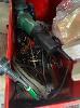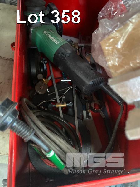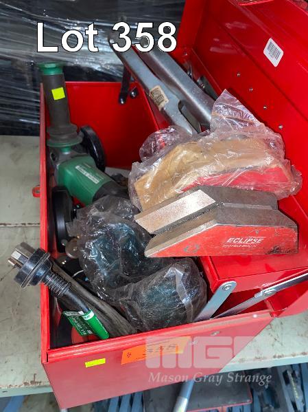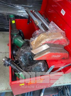TOOLBOX & ASSORTED HAND TOOLS, INC HACKS AWS, CLAMPS, MEASURING TAPES, PROTRACTORS, MAGNETIC WELDING CLAMP BLOCKS & HITACHI ANGLE GRINDER, 125mm, 240V