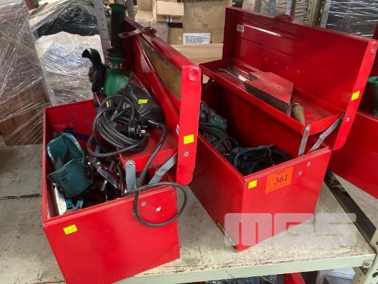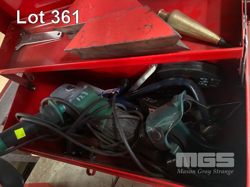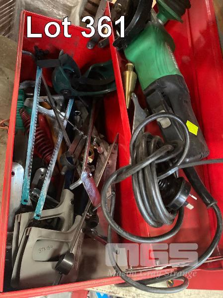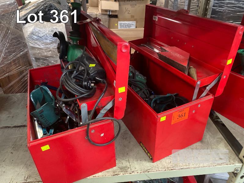 2 x TOOLBOXES & ASSORTED HAND TOOLS, INC HACKS AWS, CLAMPS, MEASURING TAPES, PROTRACTORS, MAGNETIC WELDING CLAMP BLOCKS & HITACHI ANGLE GRINDER, 125mm, 240V