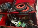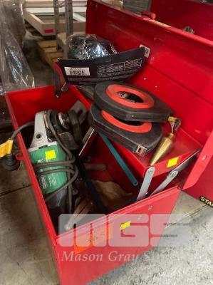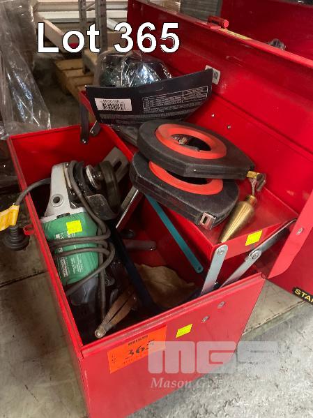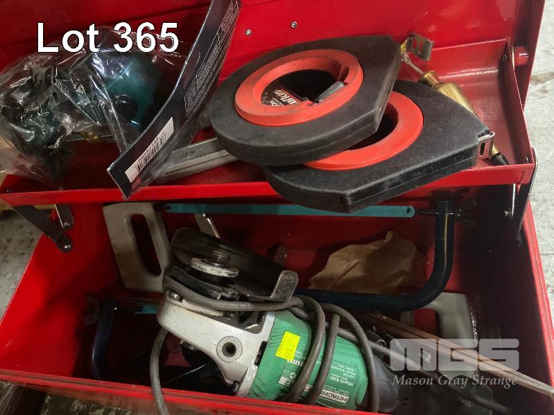 TOOLBOX & ASSORTED HAND TOOLS, INC HACKS AWS, CLAMPS, MEASURING TAPES, PROTRACTORS, MAGNETIC WELDING CLAMP BLOCKS & HITACHI ANGLE GRINDER, 125mm, 240V