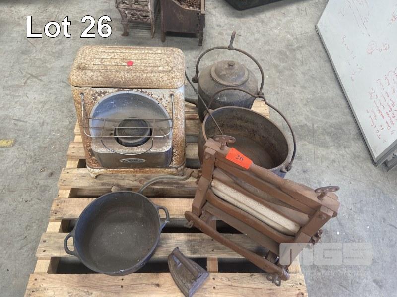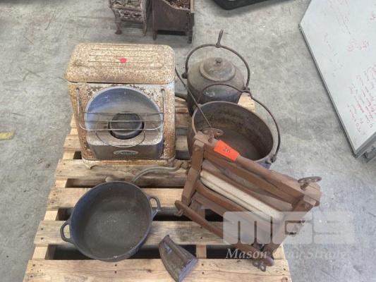 THE COLLECTORS PALLET. 2 x CAST IRON POTS, 1 x CAST IRON KETTLE KERO HEATER & SMALL MANGLE