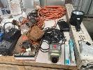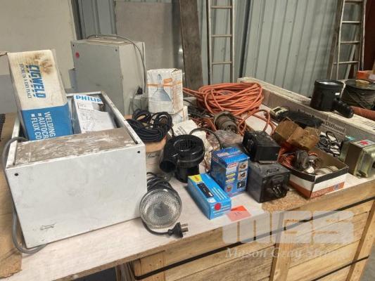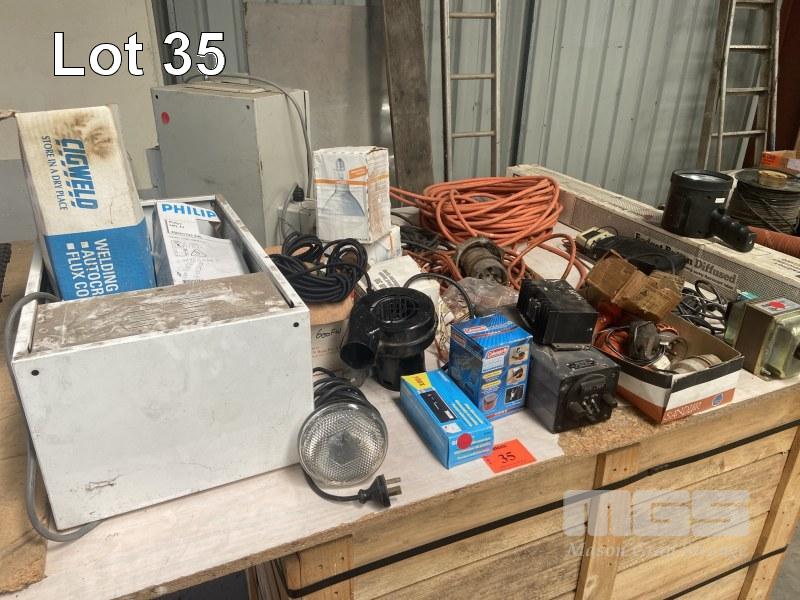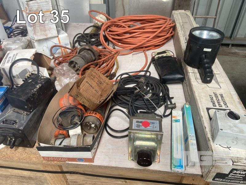 ASSORTED ELECTRICAL INC WORK LIGHTS, CABLE, PLUGS, SWITCHES, STEP DOWN TRANSFORMER, FLURO LIGHT & ELECTRICAL ENCLOSURE