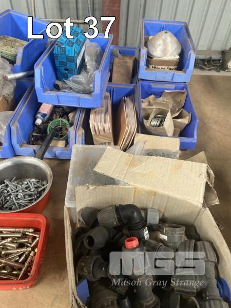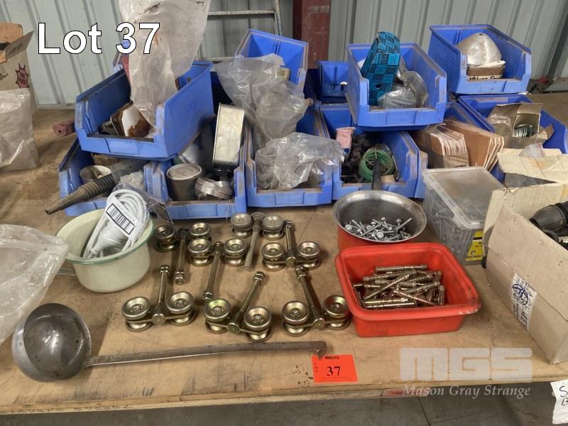 ASSORTED HARDWARE INC POLY PIPE FITTINGS, HEAVY DUTY DOOR ROLLERS, SCREWS, BOLTS, WASHERS, CLAMPS & MORE