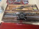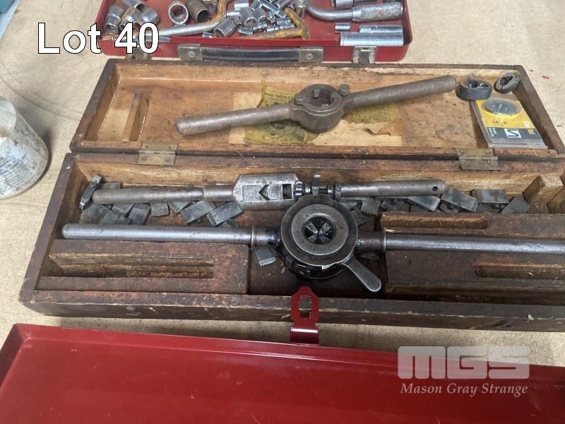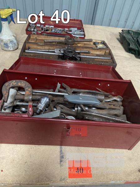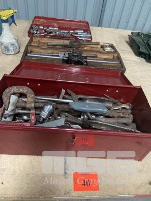 TOOL BOX & CONTENTS CLAMPS, SPANNERS, CHISELS, PUNCHES, PLUS PIPE DIES & STOCKS, SOCKETS ETC.
