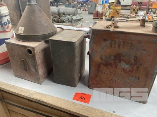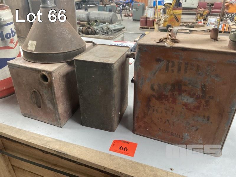 3 x EARLY OIL CANS INC, 2 IMPERIAL GALLON SHELL & 2 MORE WITH STEEL FUNNEL