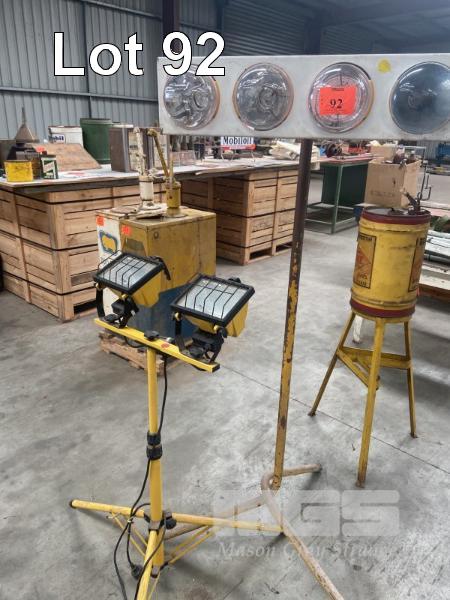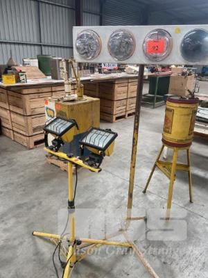 PAIR WORK LIGHT STANDS INC, 1 x 4 GLOBE HEAT LAMP & 1 x 2 HEAD HALOGEN LAMP