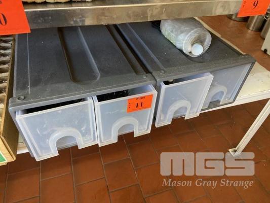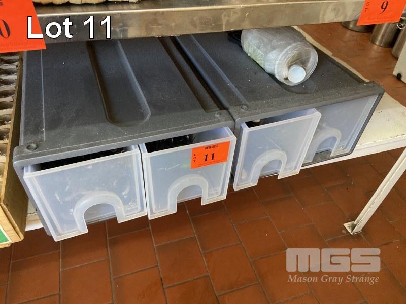 2 x DUAL PLASTIC DRAWER SETS & CONTENTS, SCISSORS, KNIVES & UTENSILS