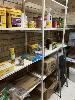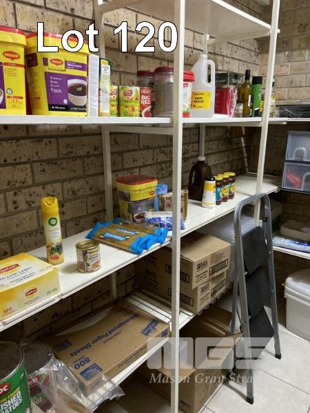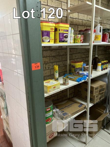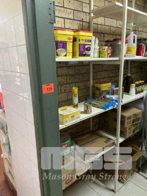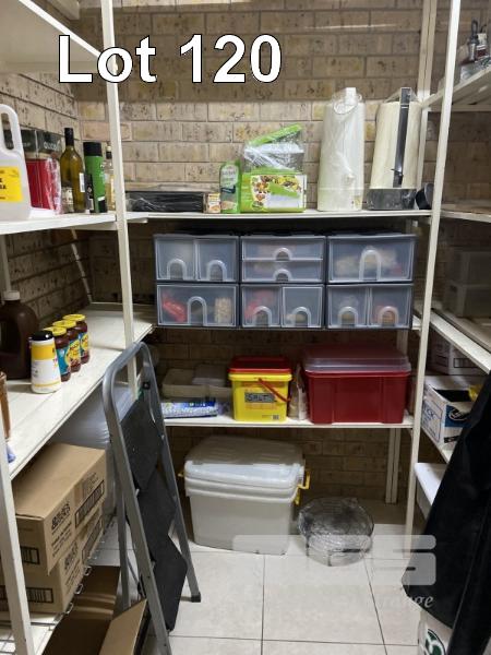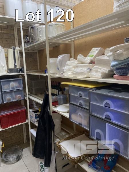 ASSORTED SPICES, SEASONING, SAUCES, CANNED FOOD, 3 x URNS, TRAYS, NAPKINS, & PLASTIC DRAWER SET, CONTENTS OF STORAGE ROOM