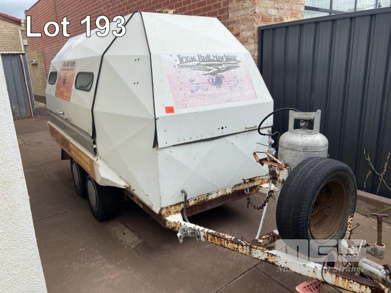 THE BBQ TRAILER REG, TJH365 DUAL AXLE, ENCLOSED DUAL SIDE LIFT UP DOORS 4 x BBQ PLATES, LPG RUBBER COUPLER HYDRAULIC BRAKES, NEED REPAIR WITH SPARE WHEEL
