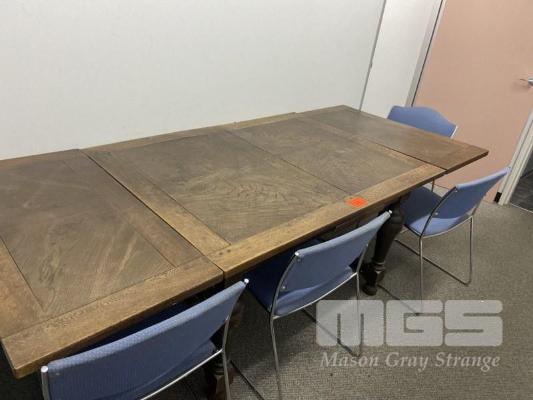 7 x BLUE FABRIC, CHROME FRAME CHAIRS & TIMBER EXTENSION TABLE