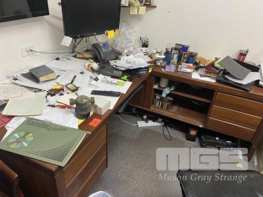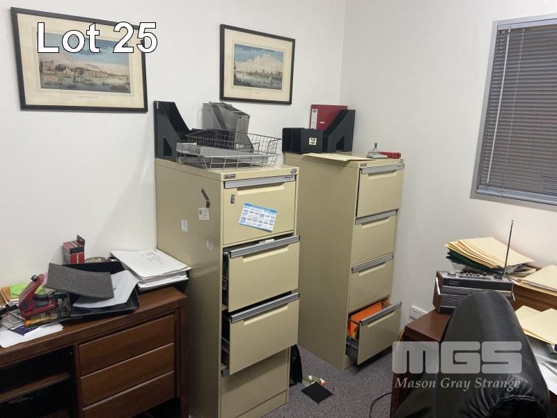 2 x DESKS, DARK TIMBER FINISH1800 X 900 & 2000 X 900. MATCHING CREDENZER, OLD SCHOOL SOLID ,GAS LIFT OFFICE CHAIR, BLACK VINYL, 2 x BENTWOOD VISITORS CHAIRS, 2 x STEEL 4 DRAWER FILING CABINETS, 3 x WALL PRINTS & BROTHER HL-1430 PRINTER (CONTENTS OF OFFICE)
