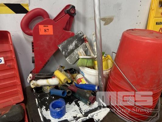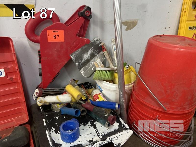 ASSORTED PLASTERING TOOLS, TAPE GUN, TROWELS, PAINT ROLLERS & TRAY