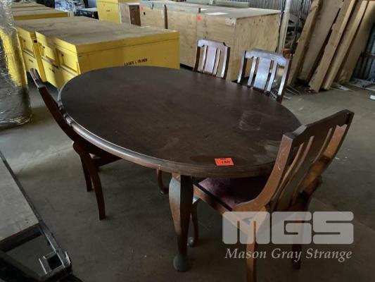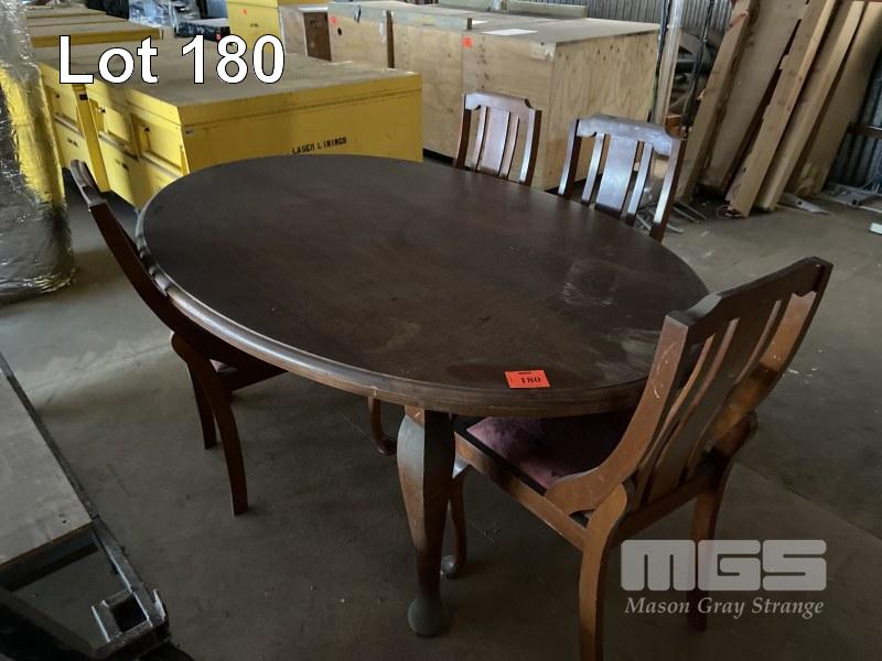 OVAL TIMBER DINING TABLE, 1800 x 1200mm & 4 x TIMBER & CLOTH CHAIRS