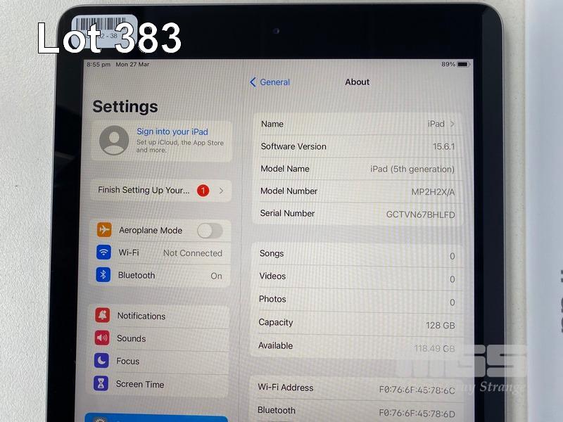 APPLE iPAD (5TH GEN), 128GB, Wi-Fi, SPACE GREY, MODEL A1822, MP2H2X/A WITH CABLE & CHARGER S/N:GCTVN67BHLFD