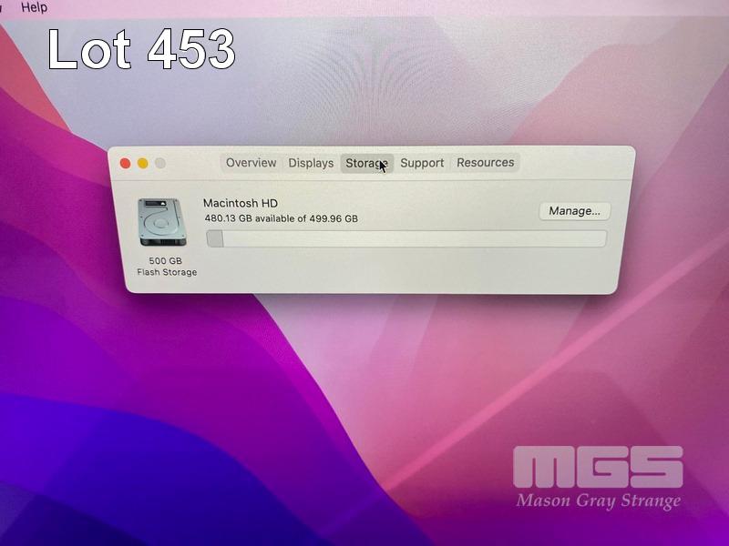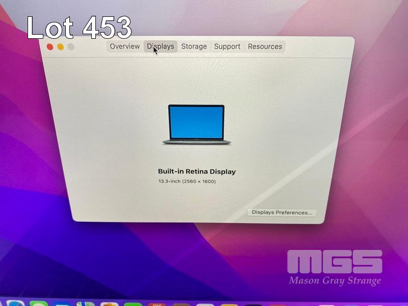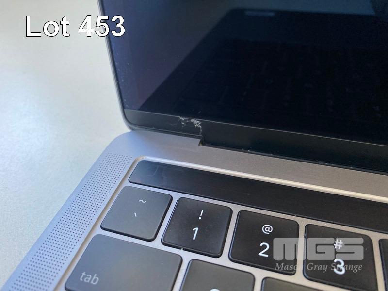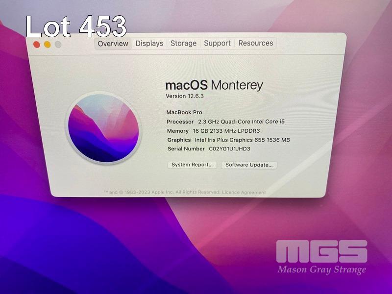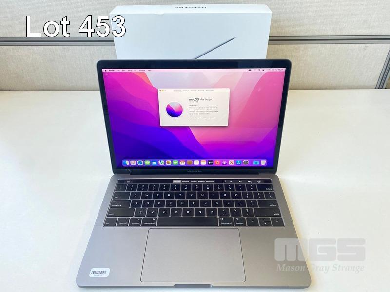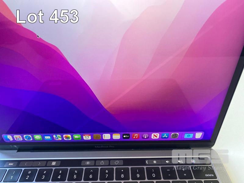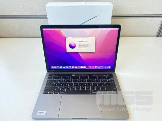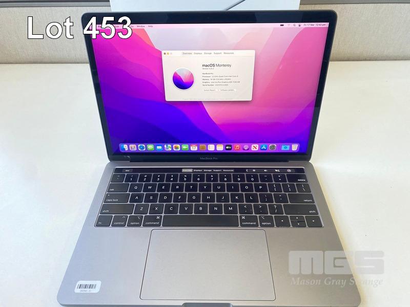 LAPTOP, APPLE MACBOOK PRO (A1989), CORE i5 8259U (8TH GEN) @ 2.3GHz, 16GB DDR3 RAM, 512GB SSD, 13.3" RETINA WIDESCREEN (2560x1600), INTEL IRIS PLUS GRAPHICS 655, Wi-Fi, MAC OS 12.6 INSTALLED (NO USB-C POWER SUPPLY) (NOTE: DIAGONAL BRIGHT LINE ON SCREEN, DAMAGE TO SCREEN FRAME, MARKS ON SCREEN) S/N:C02YG1U1JHD3