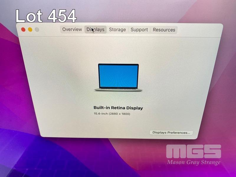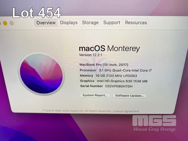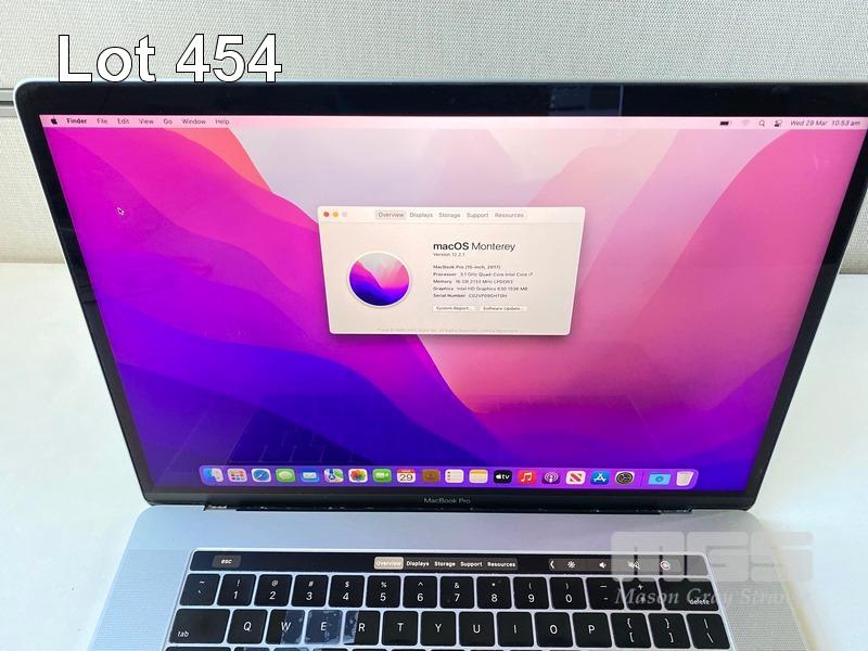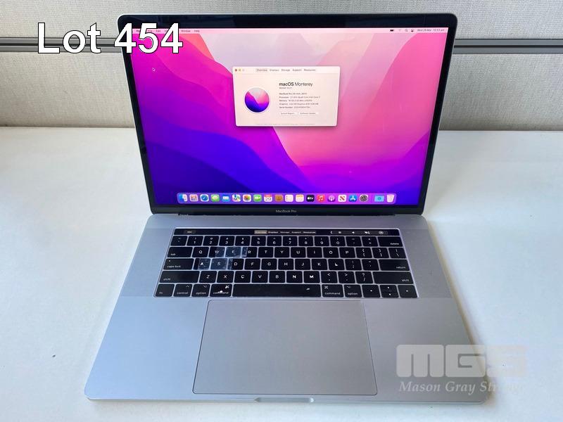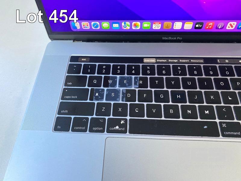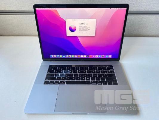 LAPTOP, APPLE MACBOOK PRO (A1707), CORE i7 7920HQ (7TH GEN) @ 3.1GHz, 16GB DDR3 RAM, 512GB SSD, 15.4" RETINA DISPLAY (2880x1800), INTEL HD GRAPHICS 630, THUNDERBOLT 3, TOUCHBAR, Wi-Fi, BLUETOOTH, MAC OS 12 INSTALLED (NO USB-C POWER SUPPLY) (NOTE: SOME KEYS LOOSE, MINOR MARKS ON SCREEN, MESSAGE "BATTERY SERVICE RECOMMENDED") S/N:C02VP09GHTDH