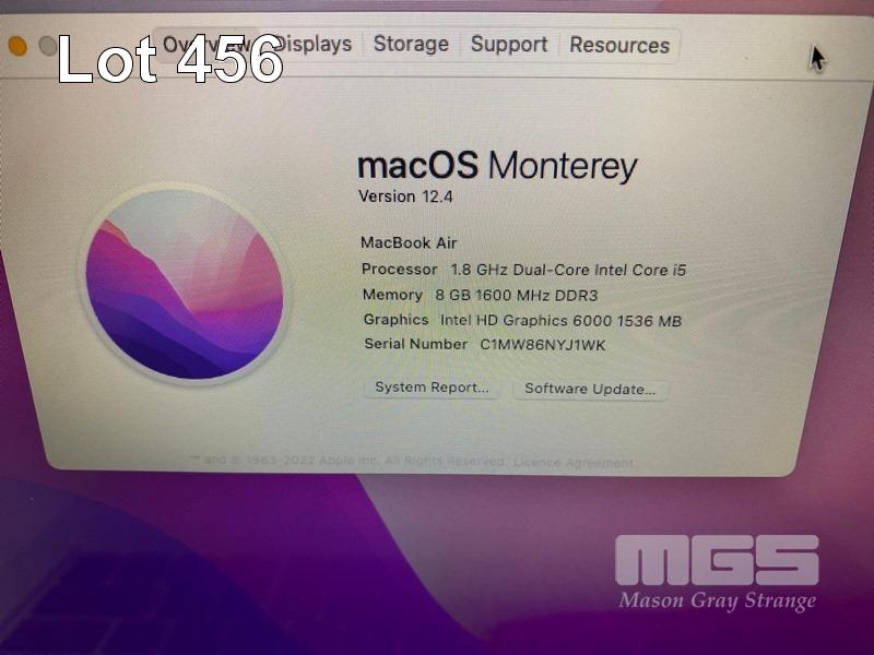 LAPTOP, APPLE MACBOOK AIR (A1466), CORE i5 5350U (5TH GEN) @ 1.8GHz, 8GB DDR3 RAM, 128GB SSD, 13.3" WIDESCREEN (1440x900), INTEL HD GRAPHICS 6000, Wi-Fi, BLUETOOTH, MAC OS 12 INSTALLED & POWER SUPPLY S/N:C1MW86NYJ1WK