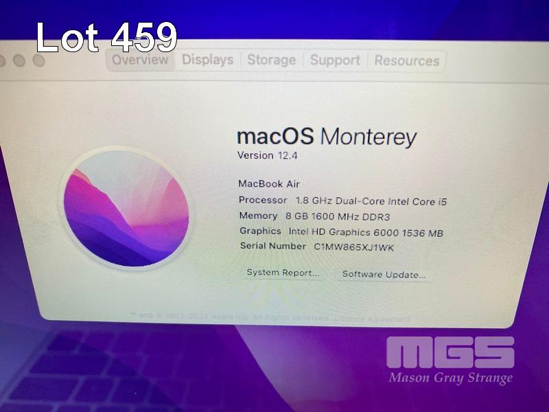 LAPTOP, APPLE MACBOOK AIR (A1466), CORE i5 5350U (5TH GEN) @ 1.8GHz, 8GB DDR3 RAM, 128GB SSD, 13.3" WIDESCREEN (1440x900), INTEL HD GRAPHICS 6000, Wi-Fi, BLUETOOTH, MAC OS 12 INSTALLED & POWER SUPPLY S/N:C1MW865XJ1WK