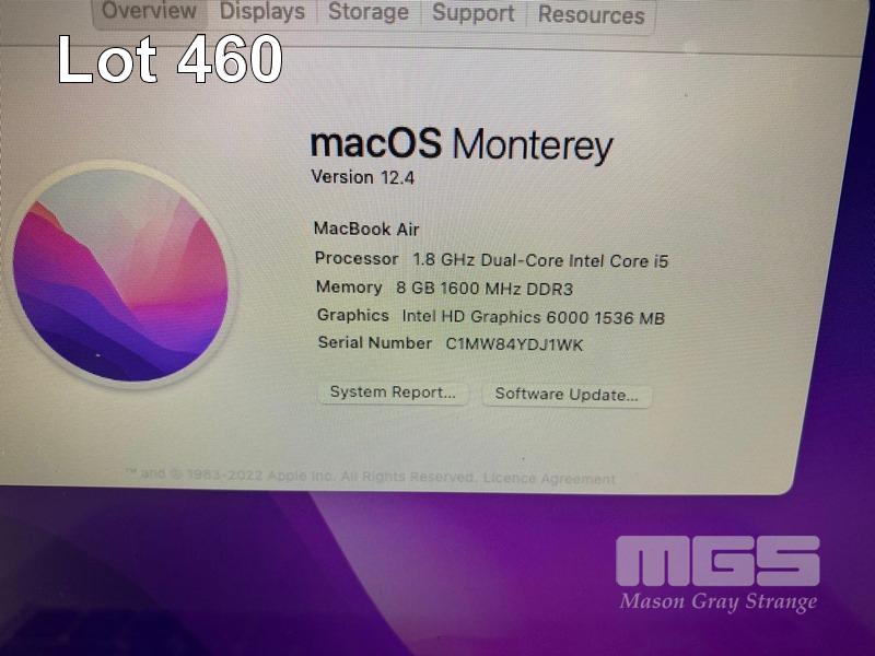 LAPTOP, APPLE MACBOOK AIR (A1466), CORE i5 5350U (5TH GEN) @ 1.8GHz, 8GB DDR3 RAM, 128GB SSD, 13.3" WIDESCREEN (1440x900), INTEL HD GRAPHICS 6000, Wi-Fi, BLUETOOTH, MAC OS 12 INSTALLED & POWER SUPPLY S/N:C1MW84YDJ1WK