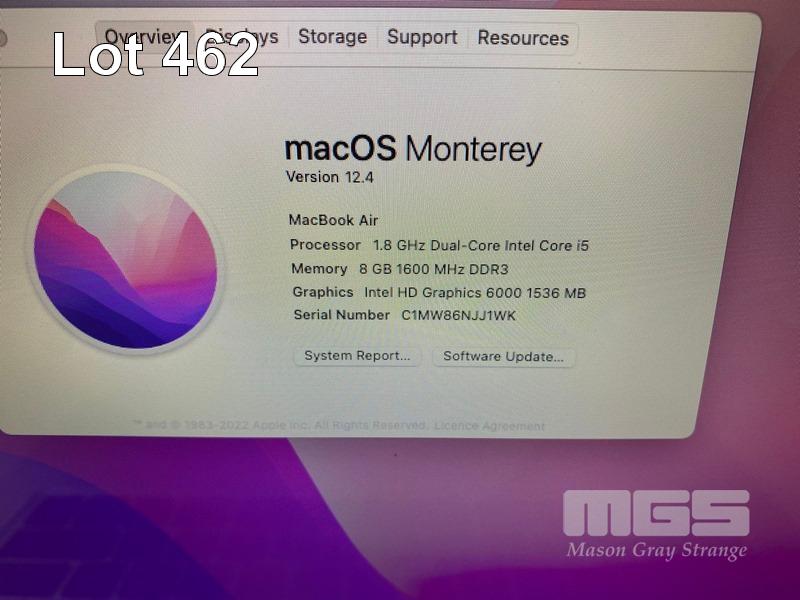 LAPTOP, APPLE MACBOOK AIR (A1466), CORE i5 5350U (5TH GEN) @ 1.8GHz, 8GB DDR3 RAM, 128GB SSD, 13.3" WIDESCREEN (1440x900), INTEL HD GRAPHICS 6000, Wi-Fi, BLUETOOTH, MAC OS 12 INSTALLED & POWER SUPPLY S/N:C1MW86NJJ1WK