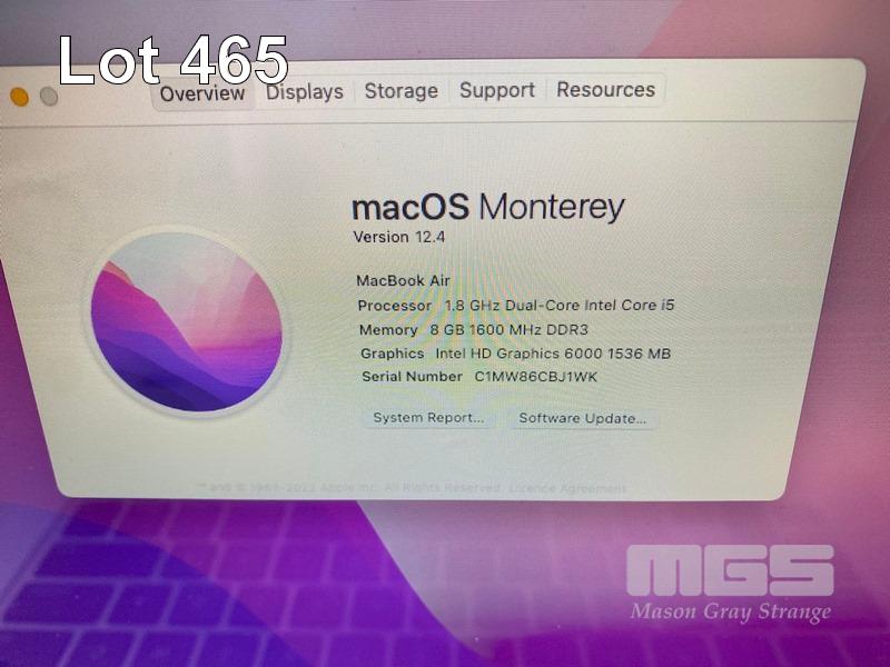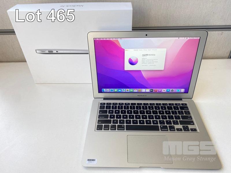 LAPTOP, APPLE MACBOOK AIR (A1466), CORE i5 5350U (5TH GEN) @ 1.8GHz, 8GB DDR3 RAM, 128GB SSD, 13.3" WIDESCREEN (1440x900), INTEL HD GRAPHICS 6000, Wi-Fi, BLUETOOTH, MAC OS 12 INSTALLED & POWER SUPPLY S/N:C1MW86CBJ1WK