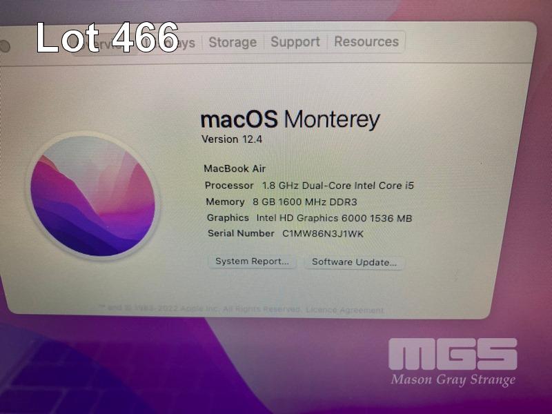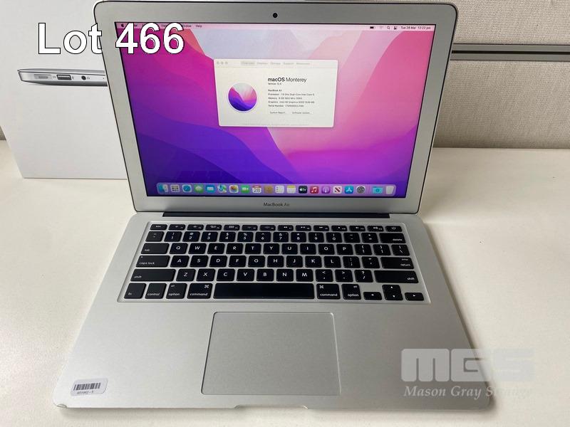 LAPTOP, APPLE MACBOOK AIR (A1466), CORE i5 5350U (5TH GEN) @ 1.8GHz, 8GB DDR3 RAM, 128GB SSD, 13.3" WIDESCREEN (1440x900), INTEL HD GRAPHICS 6000, Wi-Fi, BLUETOOTH, MAC OS 12 INSTALLED & POWER SUPPLY S/N:C1MW86N3J1WK