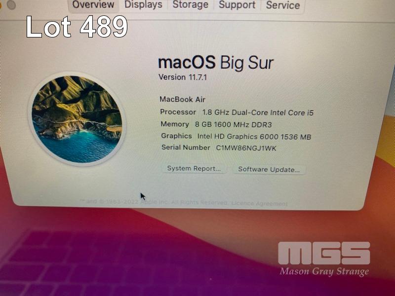 LAPTOP, APPLE MACBOOK AIR (A1466), CORE i5 5350U (5TH GEN) @ 1.8GHz, 8GB DDR3 RAM, 128GB SSD, 13.3" WIDESCREEN (1440x900), INTEL HD GRAPHICS 6000, Wi-Fi, BLUETOOTH, MAC OS 11.7 INSTALLED & POWER SUPPLY S/N:C1MW86NGJ1WK