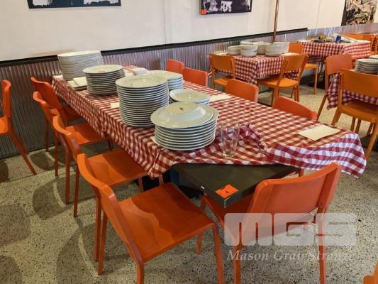 LONG DINING TABLE, PARTICAL BOARD TOP, 2600 x 880mm, BLACK STEEL BASE, WITH 9 x ORANGE PLASTIC CHAIRS, STEEL FRAME