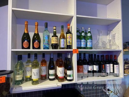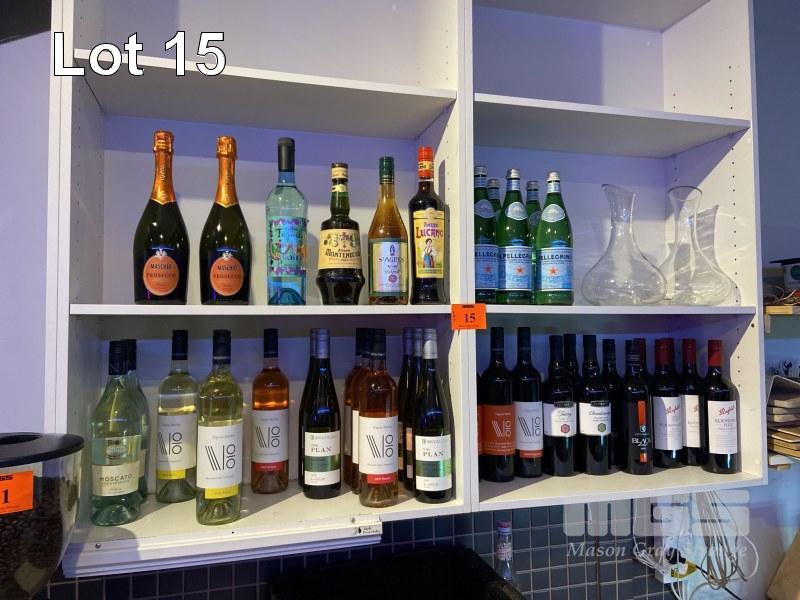 31 (APPROX) x BOTTLES WINE INC PENFOLDS, PATRITI VIGNA, BROWN BROS, ETC 6 x BOTTLES PELLEGRINO SPARKLING WATER, 1 x BOTTLE AMARO MONTENEGRO, 1 x BOTTLE ST AGNES BRANDY 1 x BOTTLE AMRO LUCANO 2 x GLASS DECANTERS 1 x BOTTLE TEQUILA