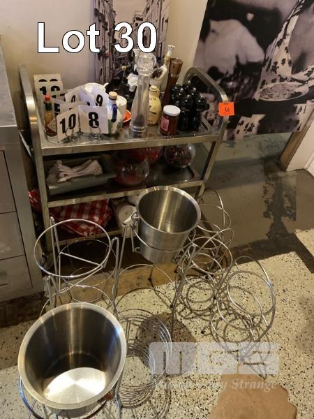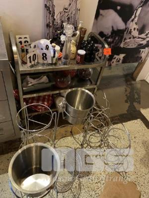 STAINLESS STEEL SERVING TROLLEY, 3 TIER & CONTENTS, STAINLESS STEEL ICE BUCKETS & STANDS & TABLE NUMBERS