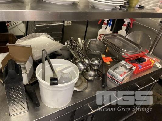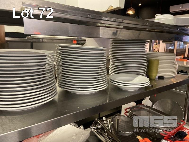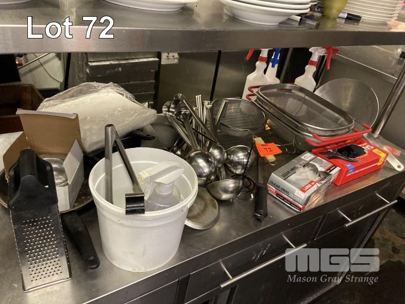 ASSORTED KITCHEN UTENSILS INC SIEVES, KNIVES, TONGS, ETC, MASHER, WHITE PORCELAIN PLATES, 60 x 280mm & 16 x 310mm
