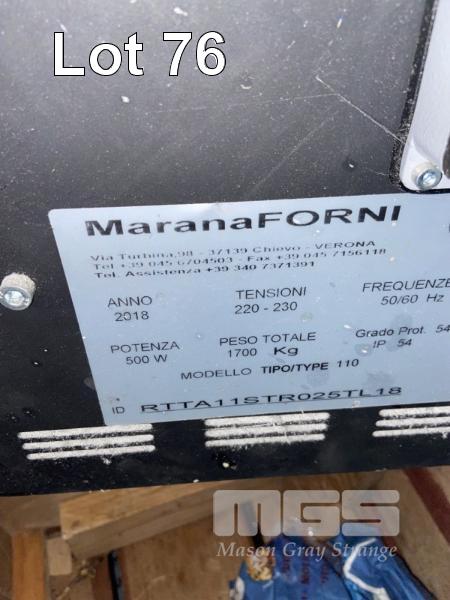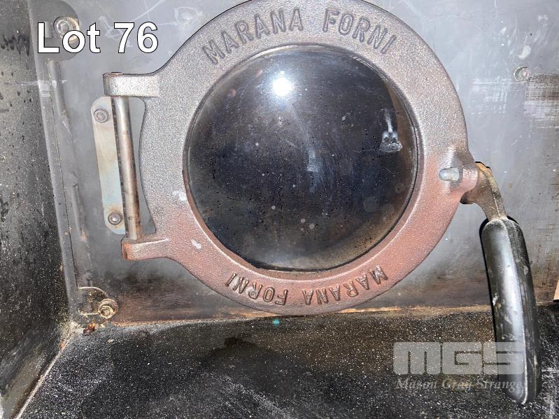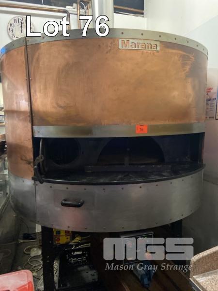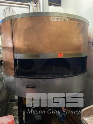 MARNA FORNI TURBO WOOD PIZZA OVEN, ON STAND MODEL: 110 DOM: 2018 ROTATING COOKING SURFACE,1080mm (D) WOOD / CHARCOAL UNIT WITH NATURAL GAS LIGHTING SYSTEM MADE IN ITALY BUYER TO DISCONNECT AND REMOVE ROOF TO BE MADE GOOD WITH FLU REMOVAL.