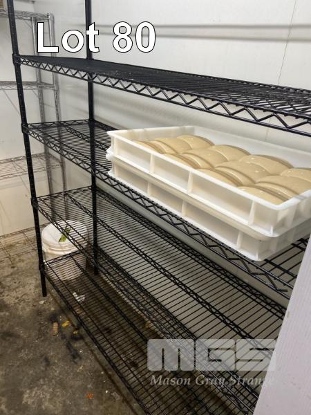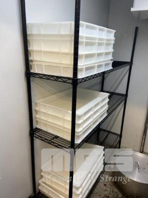 3 x COOL ROOM RACKS, MULTI TIER, ADJUSTABLE 2 @ 1800 x 1500 x 400mm 1 @ 1500 x 900 x 300mm & 13 x WHITE POLY FOOD TRAYS, 600 x 400 x 60mm