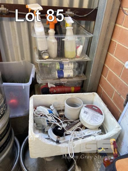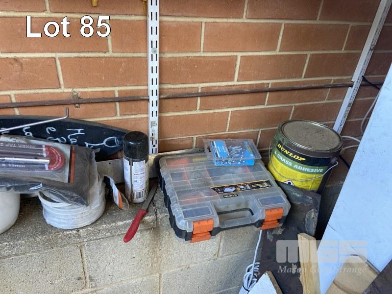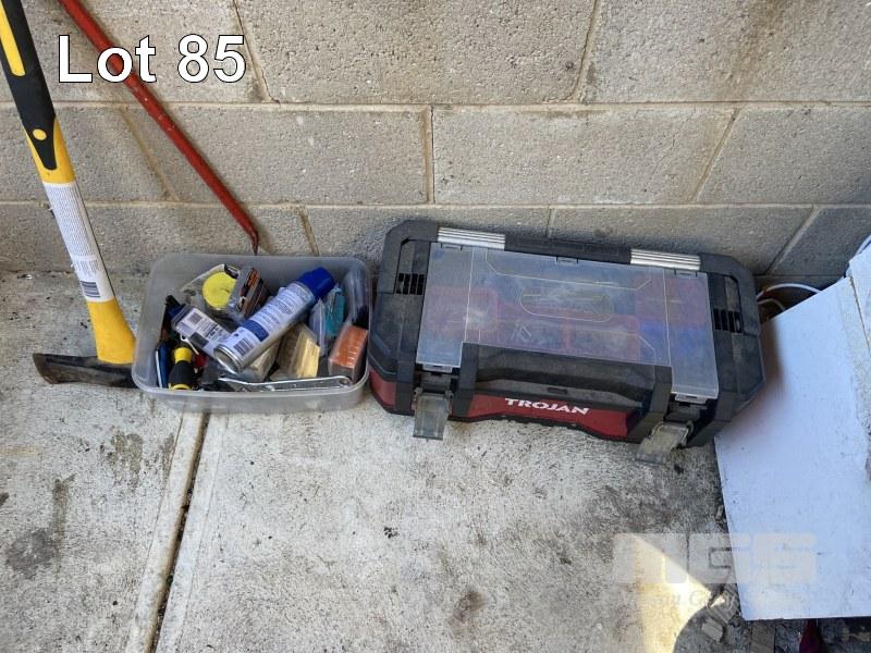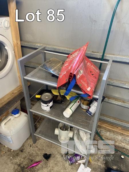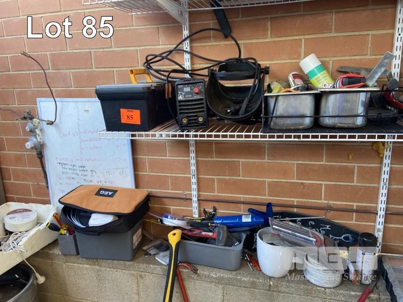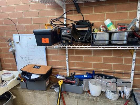 CONTENTS OF RACKS IN REAR STORAGE AREA TOOL BOXES, TOOLS, HARDWARE, FULL BOAR ARC WELDER, PAINT, TRAYS, CAULKING GUN BULK LOT!