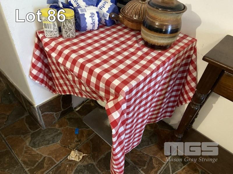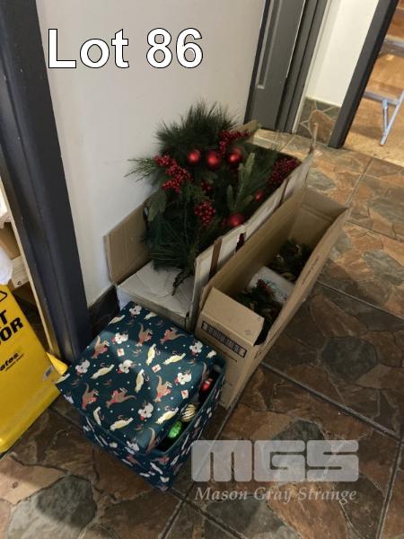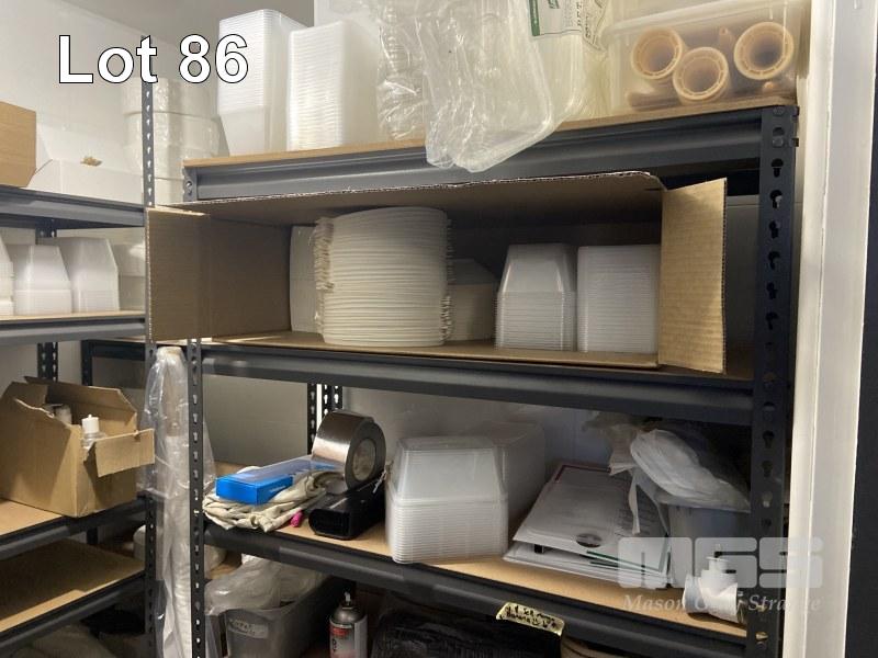 CONTENTS OF REAR STORE ROOM, DISPOSABLE CUPS, TABLE EXTENSIONS, FOOD TRAYS, XMAS TREE & DCECORATIONS, 4 x MODULAR STEEL RACKS, HAND CLEANER, 5 x SMALL TABLES, WET FLOOR SIGN & SIDEBOARD