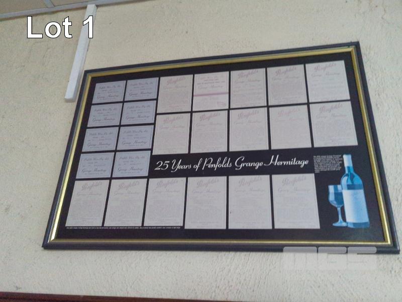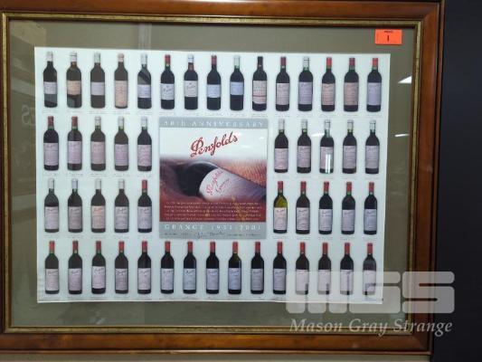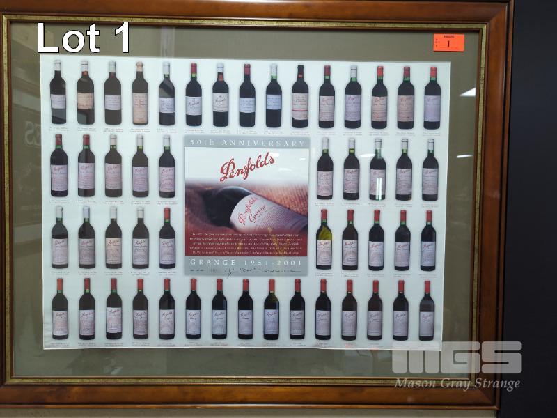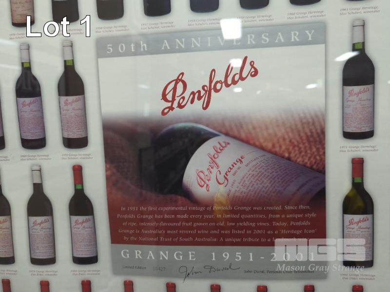 2 X TIMBER FRAMED PENFOLDS GRANGE HERMITAGE WALL HANGINGS. "25 YEARS OF PENFOLDS GRANGE HERMITAGE" AND LIMITED EDITION #00427 "50TH ANNIVERSARY GRANGE 1951 - 2001" GLAZED AND SIGNED BY JOHN DUVAL (THEN GRANGE WINEMAKER)