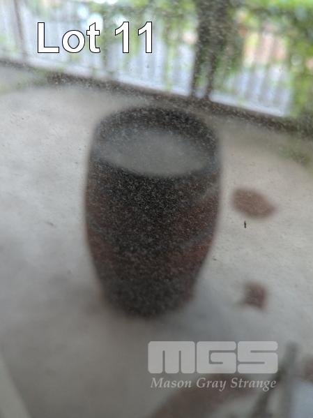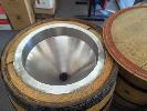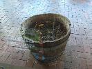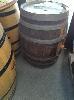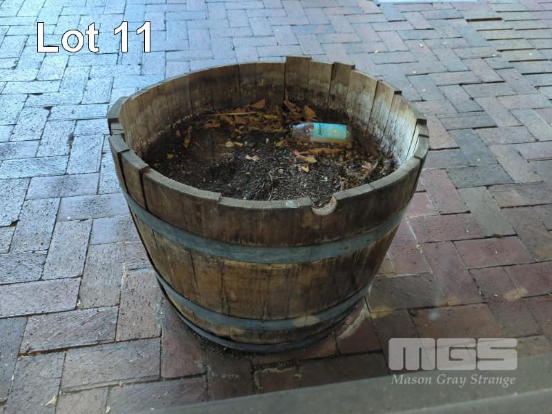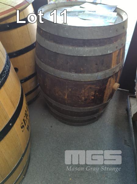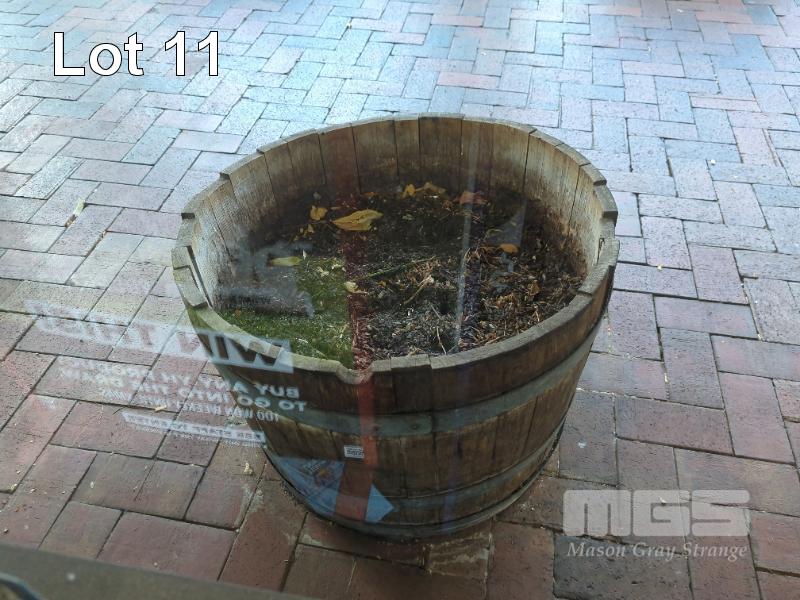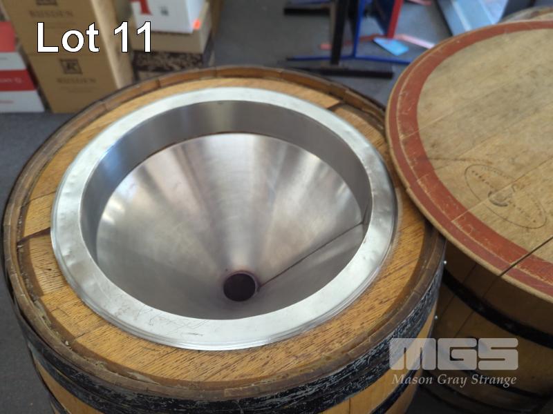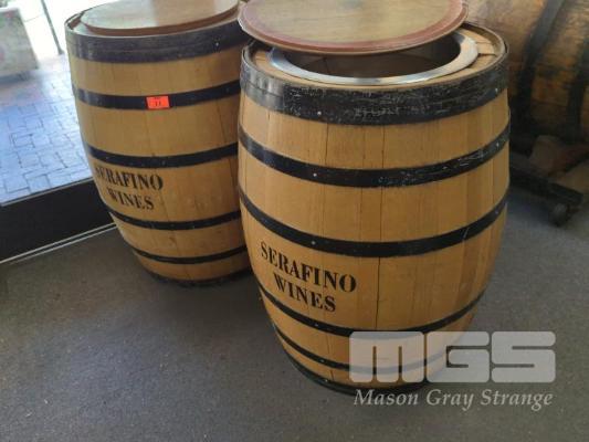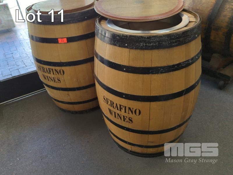 4 X WINE BARREL STANDS AND 2 X WINE BARREL PLANTERS (ALL FAULTS). TWO STENCILLED "SERAFINO WINES" AND WITH COVER TRAYS. ONE WITH STAINLESS STEEL SPITTOON. ONE LOCATED ON BALCONY UPSTAIRS.