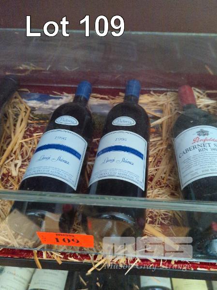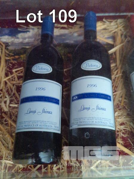 1996 MOUNT LANGI GHIRAN "LANGI SHIRAZ". 2 X 750ML CARET BOTTLES UNDER CORK. FILL LEVELS 1@ "BASE OF NECK", 1 @ "VERY TOP SHOULDER". CAPSULES 1 @ VERY GOOD, 1@ SCUFFED & CORK SLIGHTLY PUSHED. BOTTLES & LABELS GOOD TO VERY GOOD.