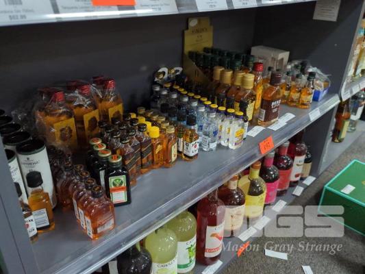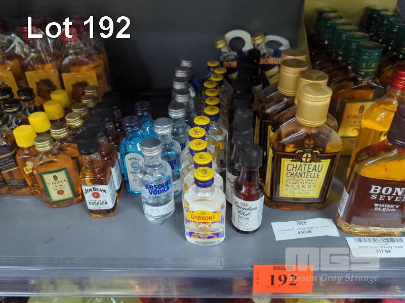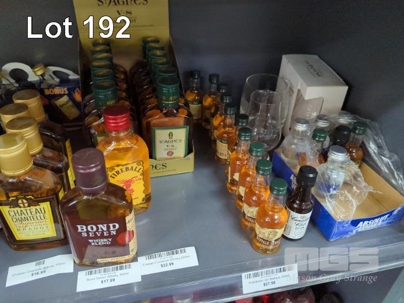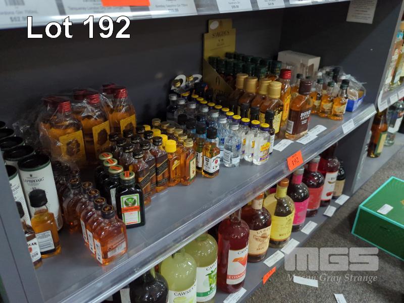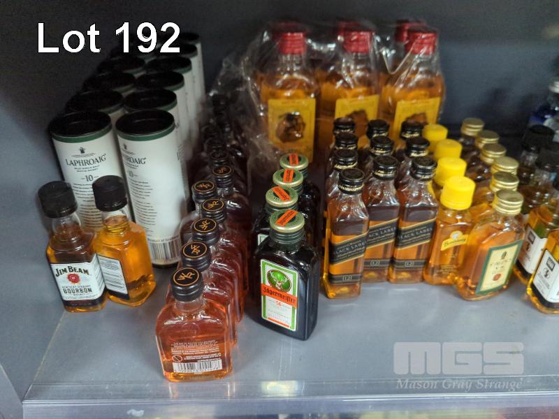 QUANTITY OF ASSORTED SMALL FORMAT SPIRIT AND LIQUEURS. STOCK UP THE MINIBAR!! ESTIMATED 130 PIECES APPROX. PLUS GLASSWARE. (1 X SHELF)