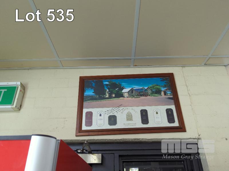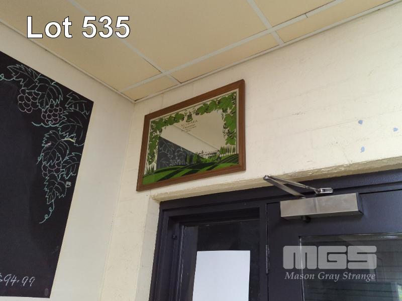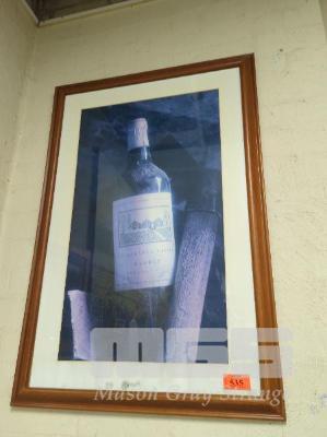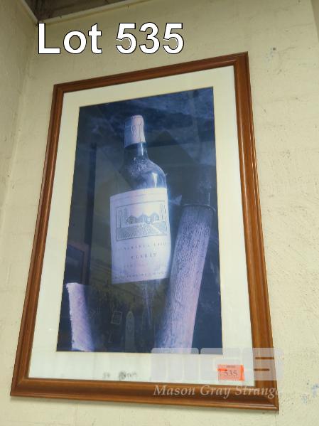 3 X PIECES OF WINE WALL ART. WYNNS CLARET POSTER FRAMED & GLAZED (SOME WATER DAMAGE), MILDARA PRINTED MIRROR FRAMED & GLAZED & CHAPEL HILL PHOTO LABEL MONTAGE FRAMED & GLAZED.