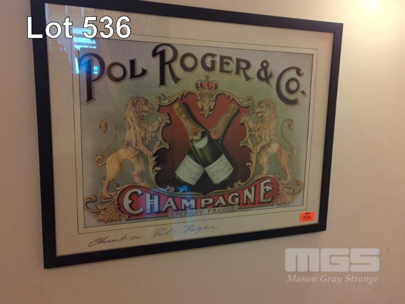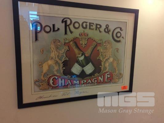 3 X PIECES CHAMPAGNE RELATED WALL ART PERRIER-JOUET PRINTED MIRROR FRAMED, POL ROGER PRINT FRAMED & GLAZED AND BLOCK MOUNTED CHAMPAGNE PIIPER