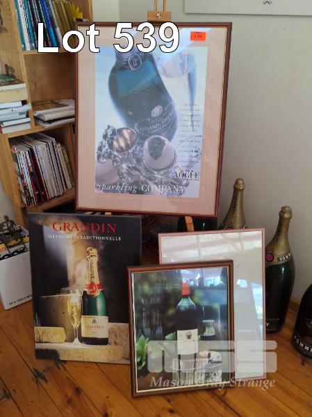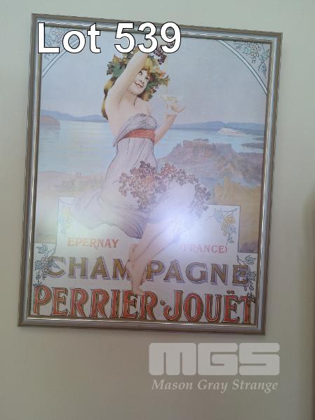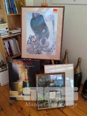 7 X PIECES OF WINE WALL ART INCLUDING CHAMPAGE PERRIER-JOUET POSTER FRAMED, BLOCK MOUNTED CHATEAU MOUTON ROTHSCHILD LABELS POSTER ETC. INCLUDES EASEL.