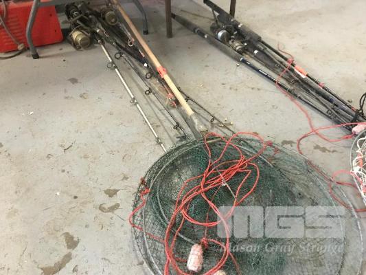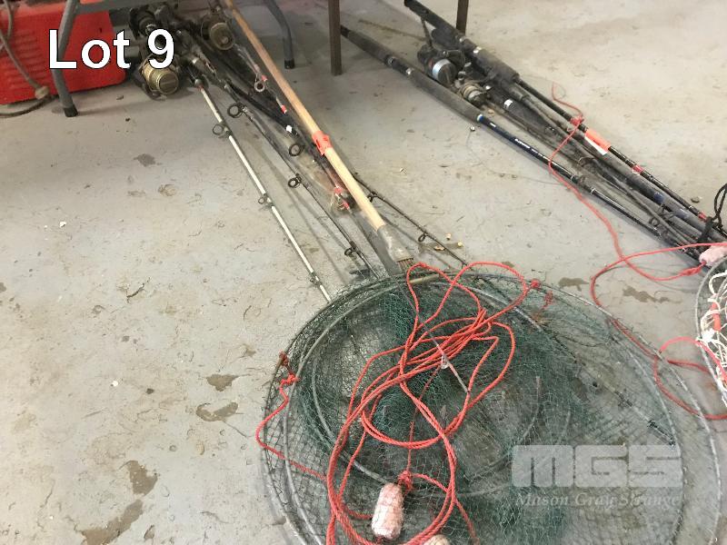 FISHING RODS, REELS, CRAB NETS & RAKE