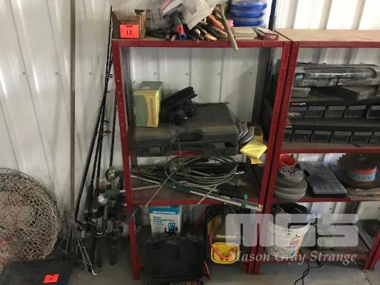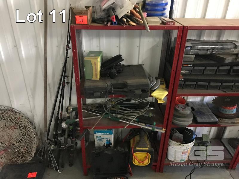 STEEL SHELF UNIT & CONTENTS INC SUB PUMP, CORDLESS DRILL,BATTERY PACK, PAINTING SUPPLIES, ETC