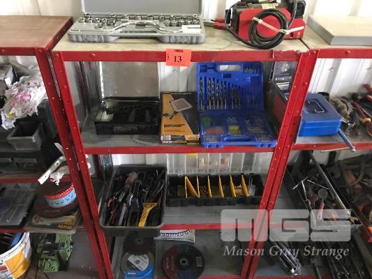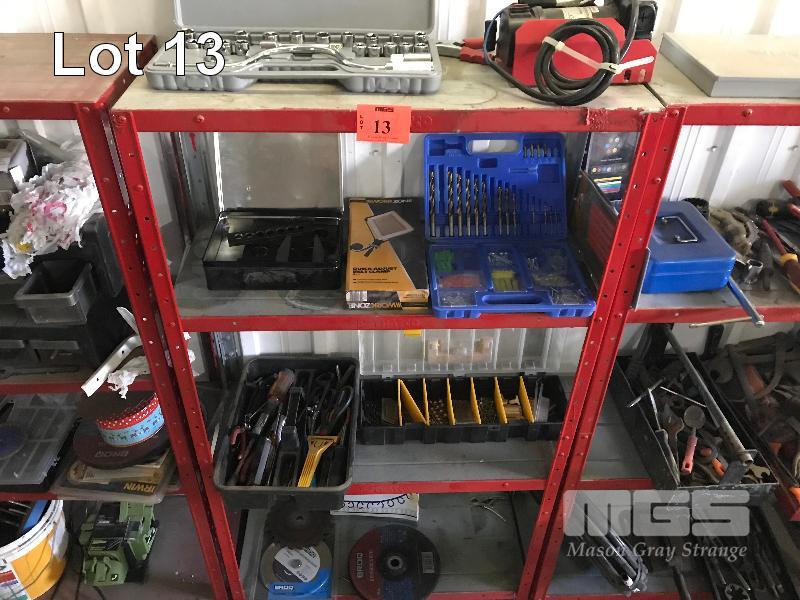STEEL SHELF UNIT & CONTENTS INC TRANSFER PUMP, DRILL BITS, GRINDING DISC, HAND TOOLS,ETC
