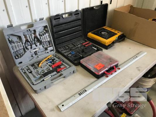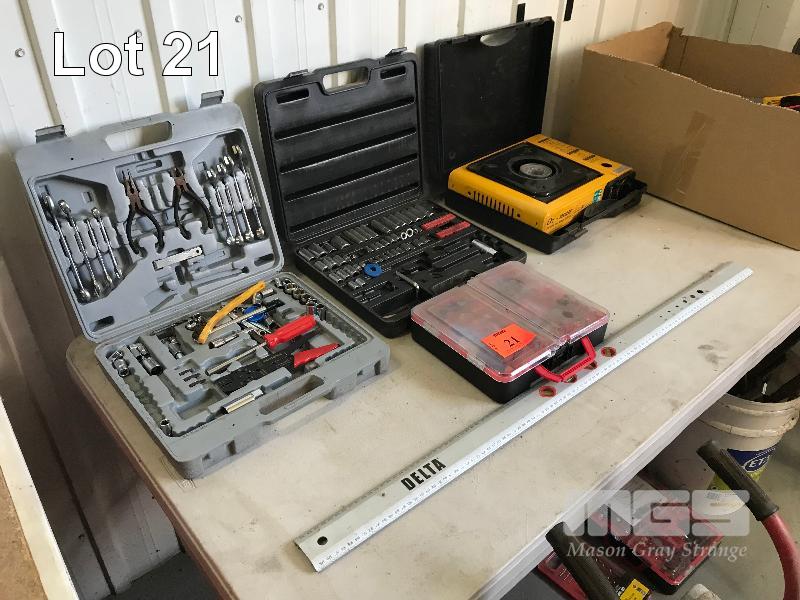 GENERAL PURPOSE TOOL KIT, SOCKET & DRILL BIT SET, ROTARY TOOL ATTACHMENT KIT, LEVELING RULE & BUTANE CAMP STOVE